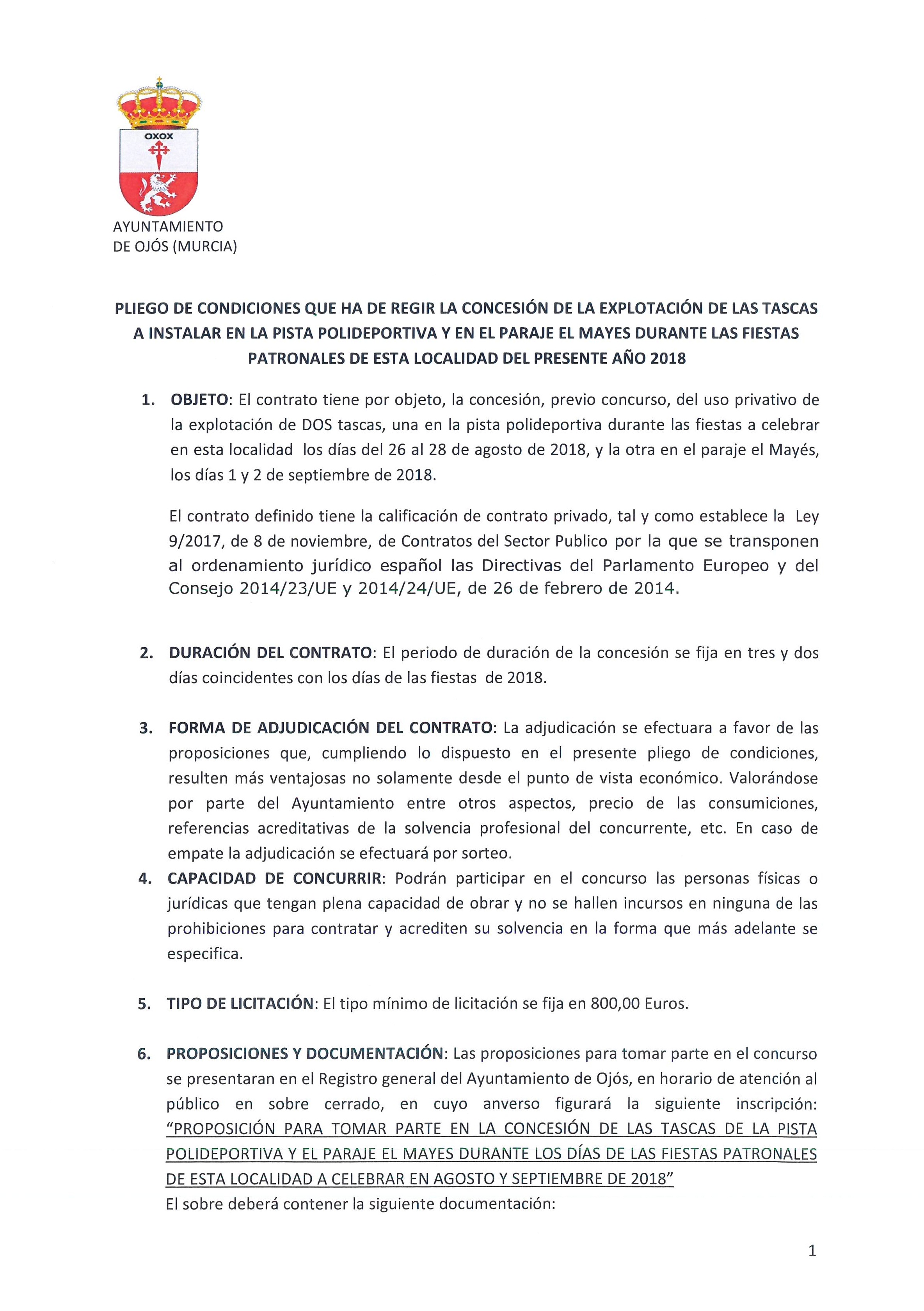 PLIEGO DE CONDICIONES TASCAS PISTA POLIDEPORTIVA Y PARAJE EL MAYÉS FIESTAS OJÓS 2018