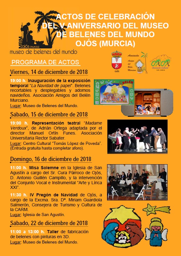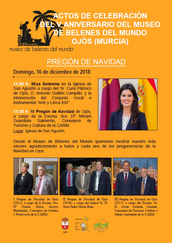 IV Pregón de Navidad de Ojós, a cargo de la Excma. Sra. Dª. Mirian Guardiola Salmerón, Consejera de Turismo y Cultura de la CARM, intervención del Conjunto Vocal e Instrumental "Arte y Lírica XXI" y posterior visita al Museo de Belenes del Mundo.