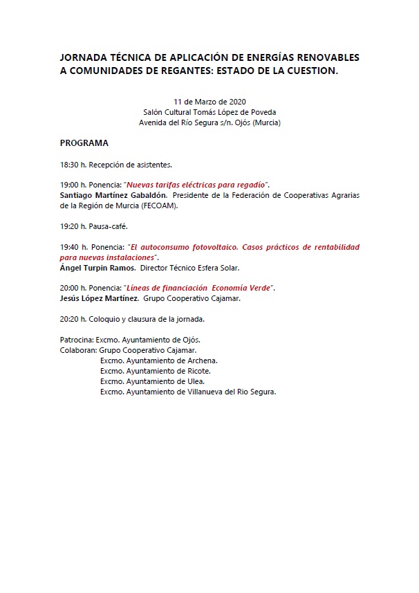 “Jornada técnica de aplicación de energías renovables a Comunidades de Regantes”, que se celebrará el día 11 de Marzo de 2020 a las 18:30 horas, en la Casa de la Cultura Tomás López de Poveda de esta localidad.