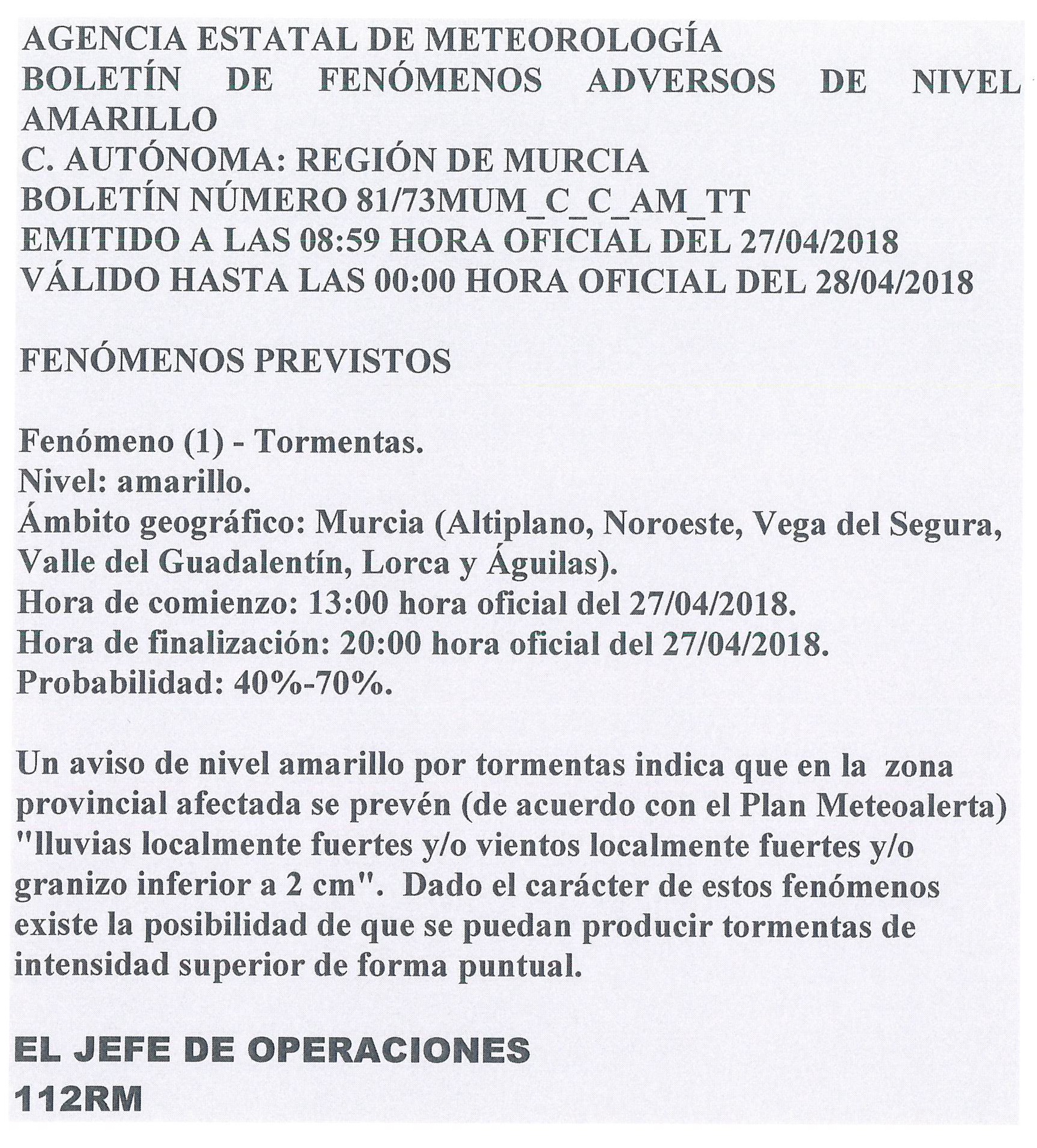BOLETÍN DE FENÓMENOS ADVERSOS DE NIVEL AMARILLOS Detalles Categoría de nivel principal o raíz: 8.-Información y Atención al Ciudadano Categoría: 8.3.-Participación Ciudadana Publicado: Viernes, 27 Abril 2018 11:31 Visto: 94213 Anterior Siguiente
